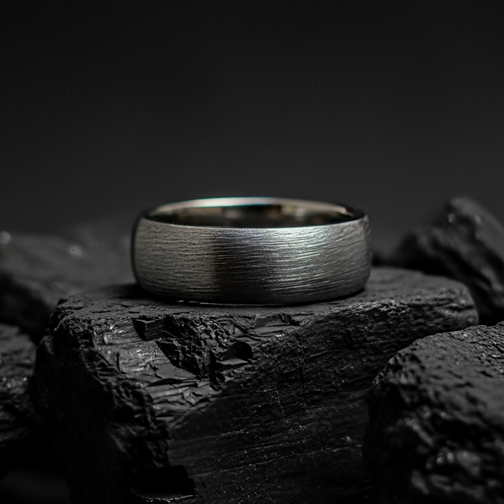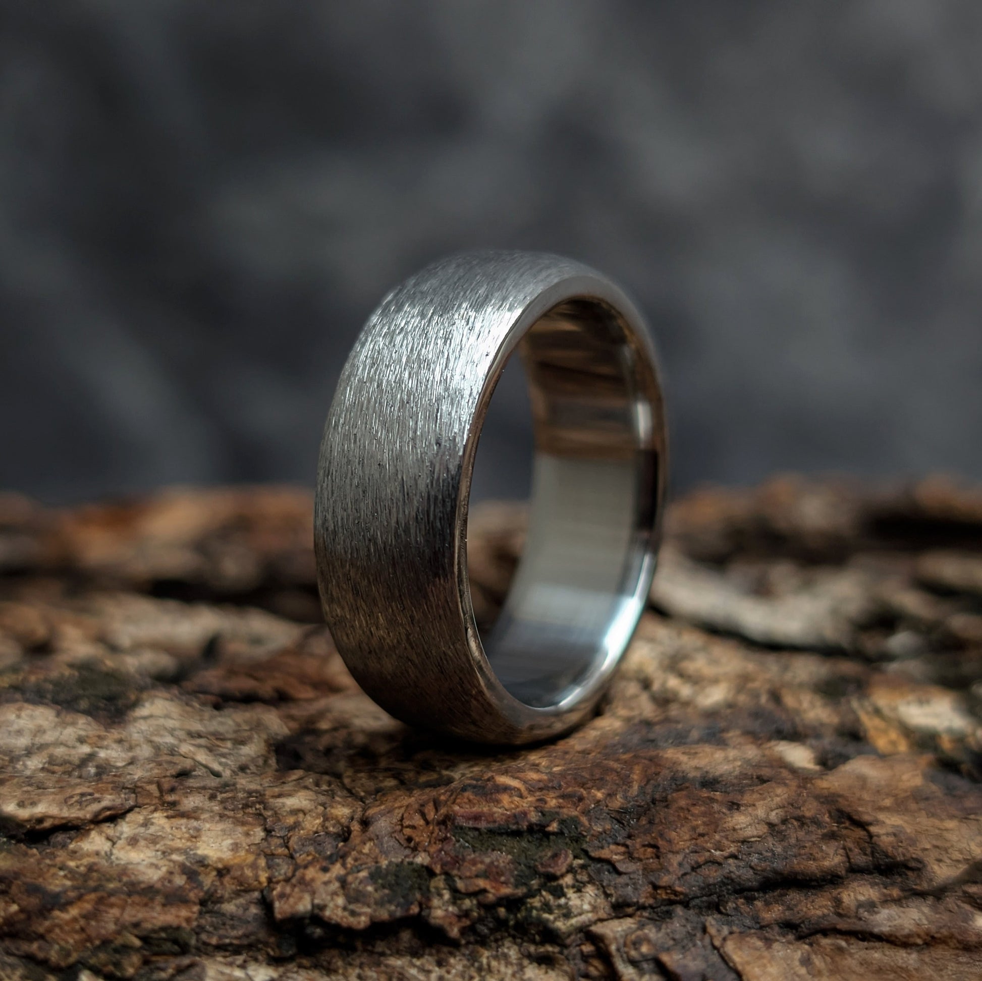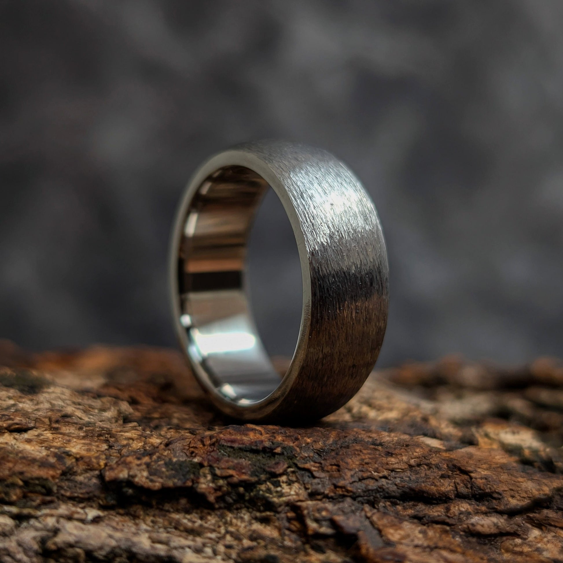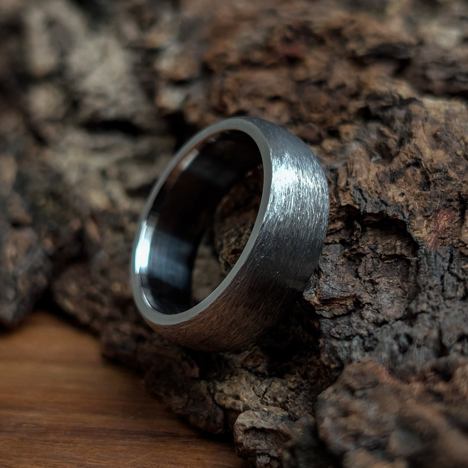 The Comet is a sleek, modern band crafted from durable, ultra-light Titanium, making it a comfortable and hypoallergenic choice for any wearer. The ring features a unique contrast: the entire outer surface is finished with a deep, textured brushed finish that evokes a raw, earthy feel, while the inner surface and edges are highly polished for comfort and shine. Its minimalist yet rugged style makes it a powerful choice for a wedding band, promise ring, or a bold everyday statement piece.