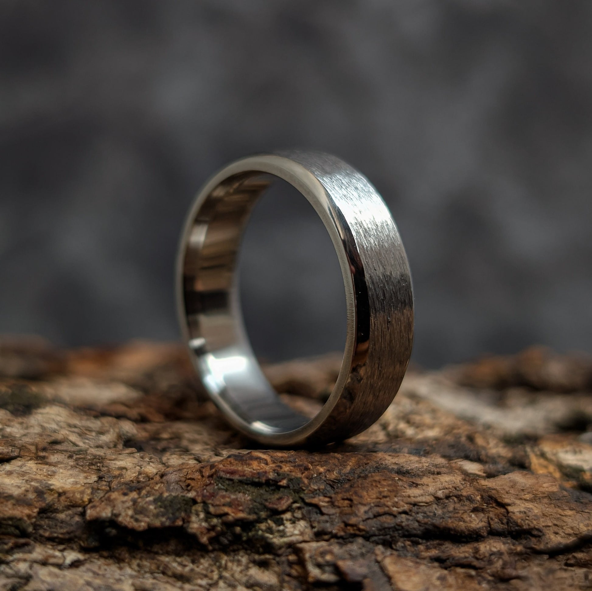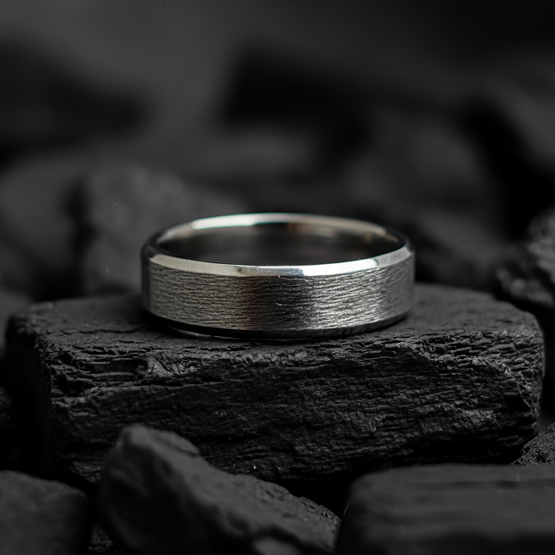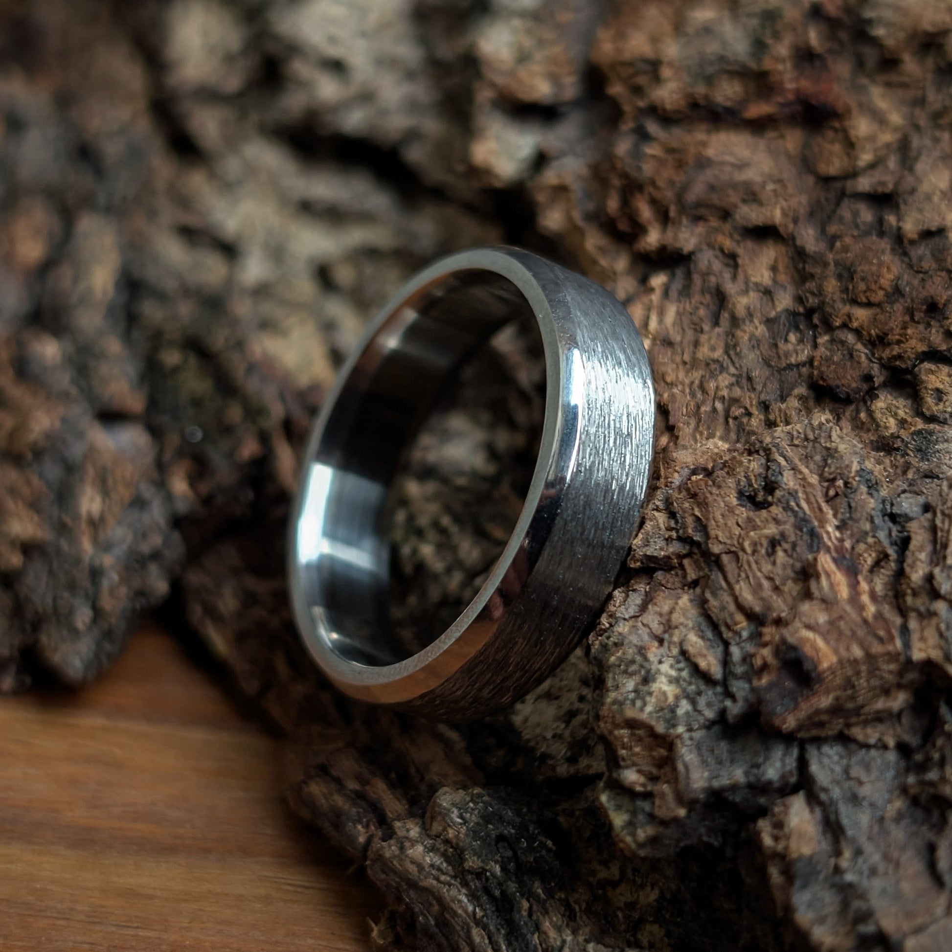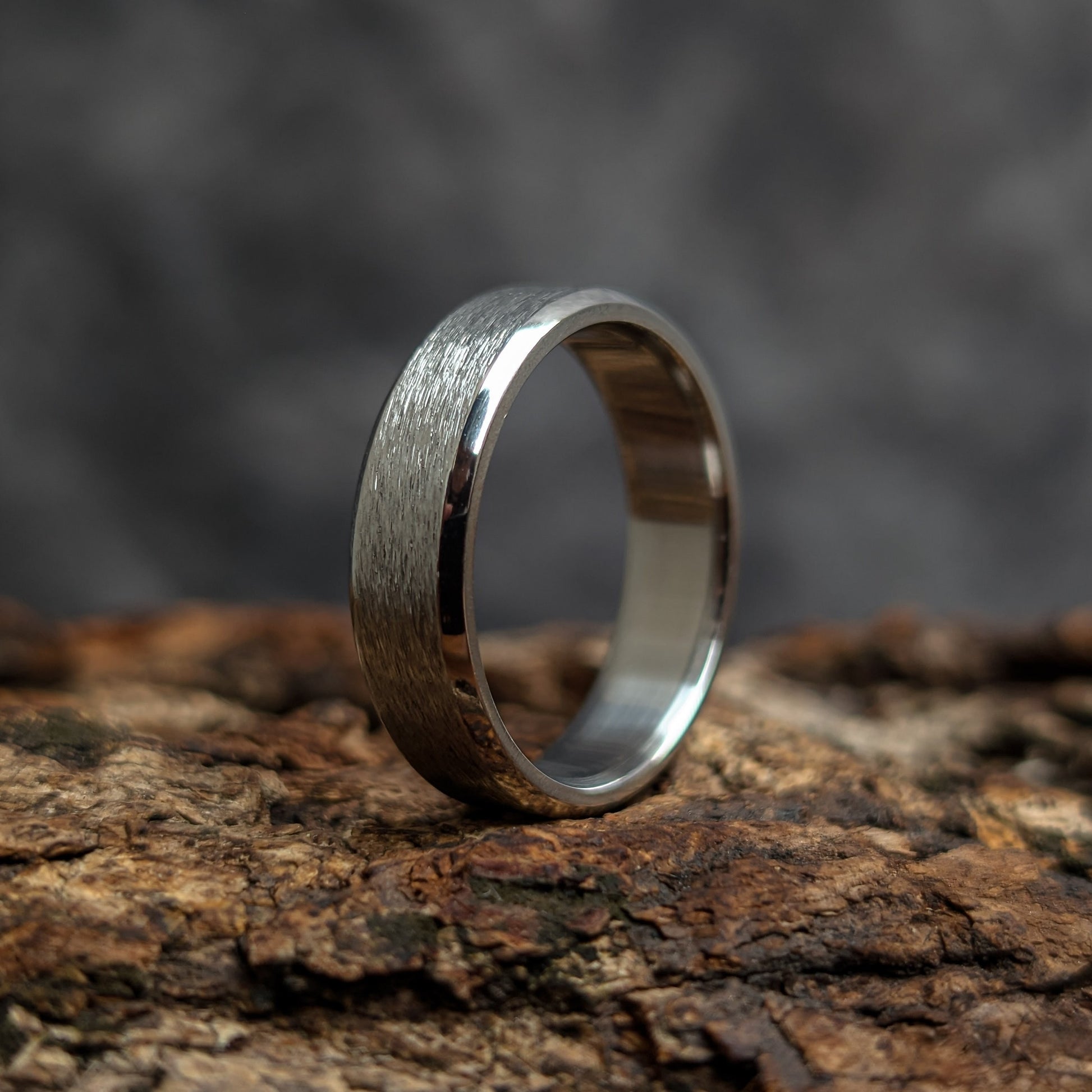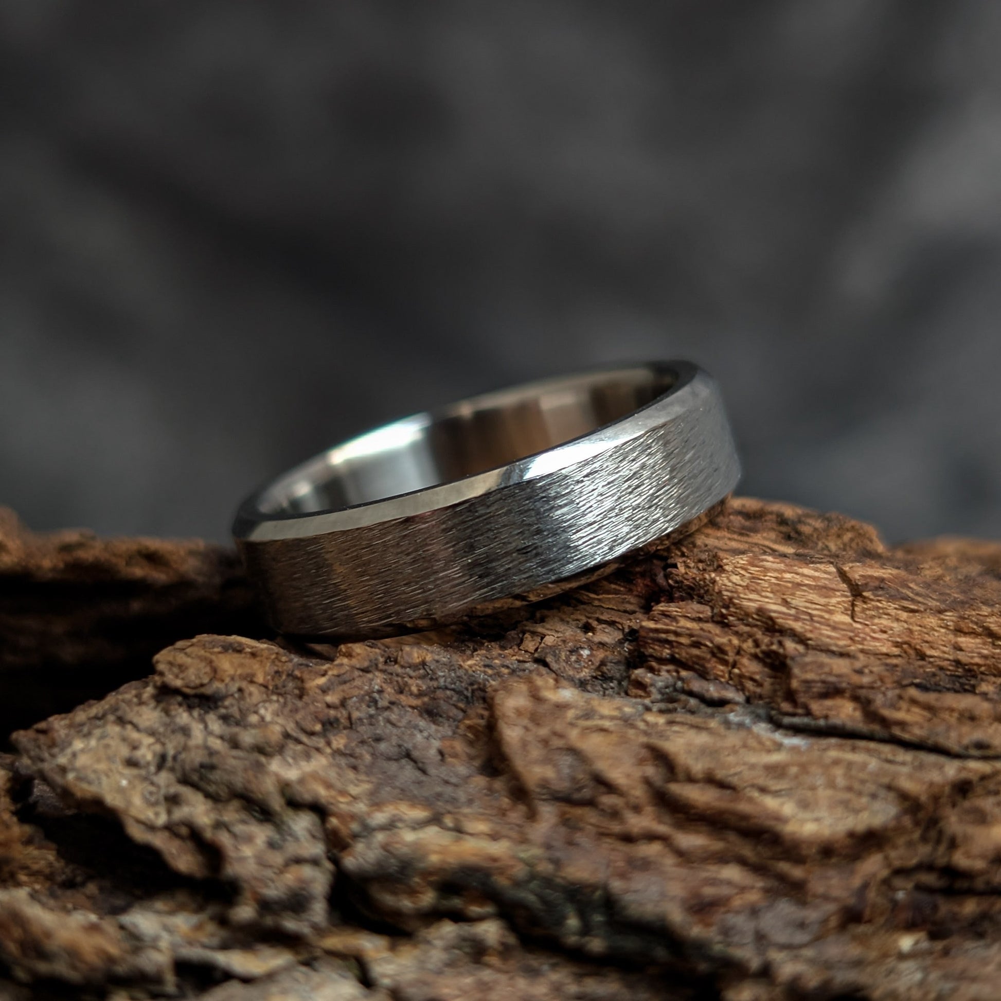 The Helix is a powerful, contemporary ring crafted from Titanium, making it a feather-light and hypoallergenic choice for any wearer. This band features a striking design contrast: a unique, textured brushed center provides a rugged, organic feel, beautifully framed by sleek, mirror-polished beveled edges. Its tough construction and smooth comfort-fit interior make it a perfect symbol for enduring commitment or simply a bold, everyday statement piece.
